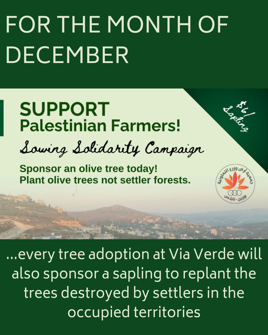 Throughout December, we will donate 5β¬ of each tree you adopt at Via Verde to support the beautiful initiative of @greenolvietours that helps our fellow olive farmers in Palestine who are still suffering in silence. Besides replanting trees, the initiative brings Israeli and international volunteers into the West bank area and raises awareness for how hard it is when your olive harvest and livelihood is threatened by radical settlers, who intentionally burn or destroy olive trees or make the harvest impossible. We know: To be a smallholder farmer is never easy – especially when facing climate extremes – but when you also have to face extreme injustice, it’s even harder. This is why this holiday season we thank you for not only supporting our small regenerative farm endeavors by adopting a tree @via.verde.umbria, but we also thank you for standing in solidarity with our fellow olive farmers in Palestine. It’s time to reconnect with nature and humanity …